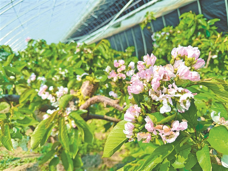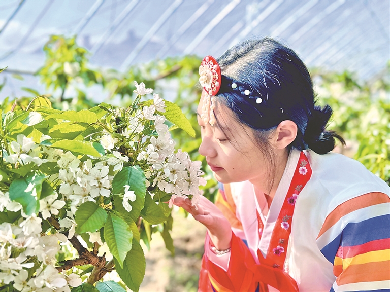 日前,汤原县汤旺朝鲜族乡大棚采摘园里樱桃花大片盛开,吸引游客到此打卡拍照。据了解,该采摘园共有11栋大棚,种植1000余棵大樱桃。樱桃成熟后,果子个头儿大,果肉厚实、硬度大,口感甜蜜,单体重量达到18克以上,年产量超7000斤,且耐储存不易开裂,受到市场青睐。(记者 丁燕摄)