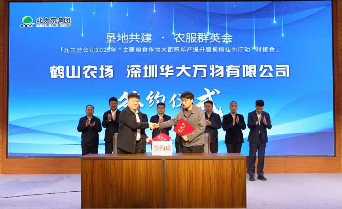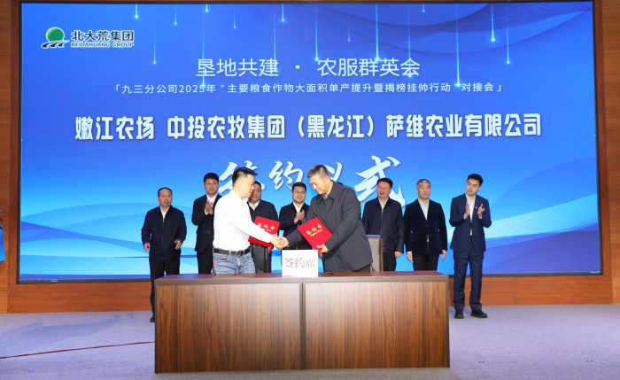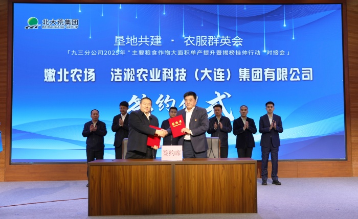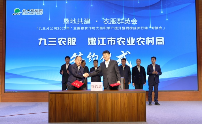 九三分公司党委副书记、总经理王福在致辞中表示,“提升粮食单产是落实国家粮食安全战略的重要举措。”“揭榜挂帅”机制将打破传统科研壁垒,整合社会资源破解技术瓶颈,加速农业科技成果从实验室走向田间地头。会议现场,九三农服与嫩江市农业农村局签署《2025年农业社会化服务协议》,推动良种推广、绿色防控等先进技术向地方辐射,构建“垦地融合、资源共享”的农业社会化服务体系。