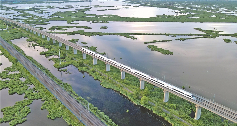 动车组列车穿过大庆龙凤湿地。记者 张澍摄