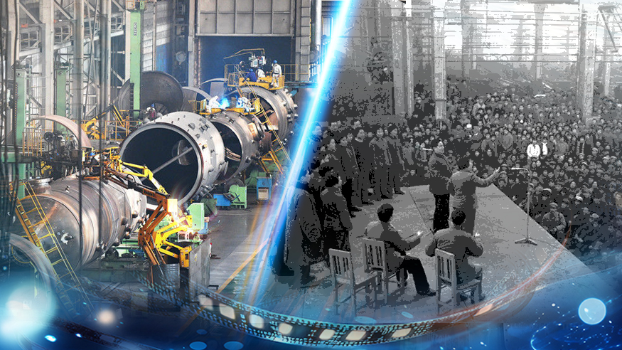 这是一张拼版图片,左图为2021年2月23日,工人在哈电集团哈尔滨锅炉厂有限责任公司的生产车间作业。(新华社记者王建威摄);右图为1973年1月,中央乐团的文艺工作者来到哈尔滨锅炉厂,为全厂职工演出交响音乐《沙家浜》片断。(新华社记者胡伟摄)