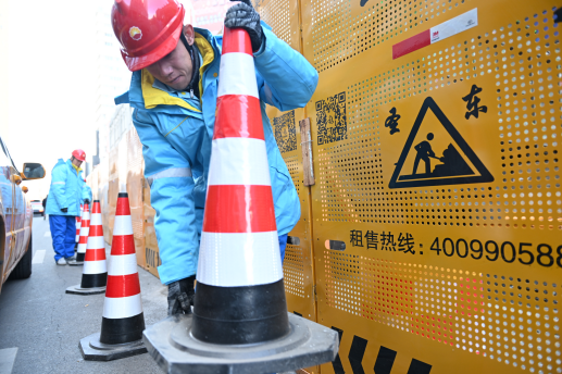 图为中庆燃气公司工作人员在施工现场安装安全警示标识。(杨程 摄)