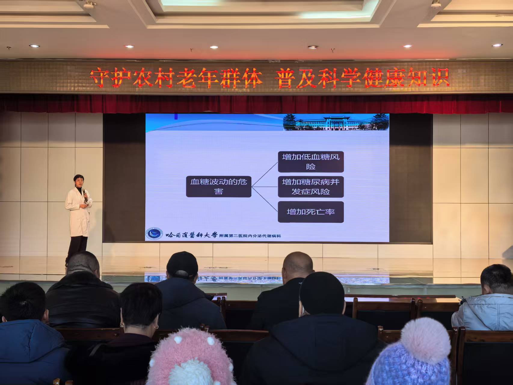 针对集贤县老年群体高度关注的糖尿病防治问题,哈医大二院内分泌科主任医师傅雪莲开展了一场主题为“关爱老年人健康,科学防治糖尿病”的公益科普讲座。讲座中,傅雪莲结合临床典型案例,用通俗易懂的语言解读专业知识。讲解内容覆盖糖尿病的分型诊断、早期预警信号、并发症危害与预防、饮食搭配、运动指导、规范用药等,主题层层递进,语言深入浅出。针对老年人常见的“血糖高点不用治”“降糖药跟风吃”“胰岛素会成瘾”等认知误区,专家逐一澄清,强调“糖尿病可防可控,科学管理是关键”。