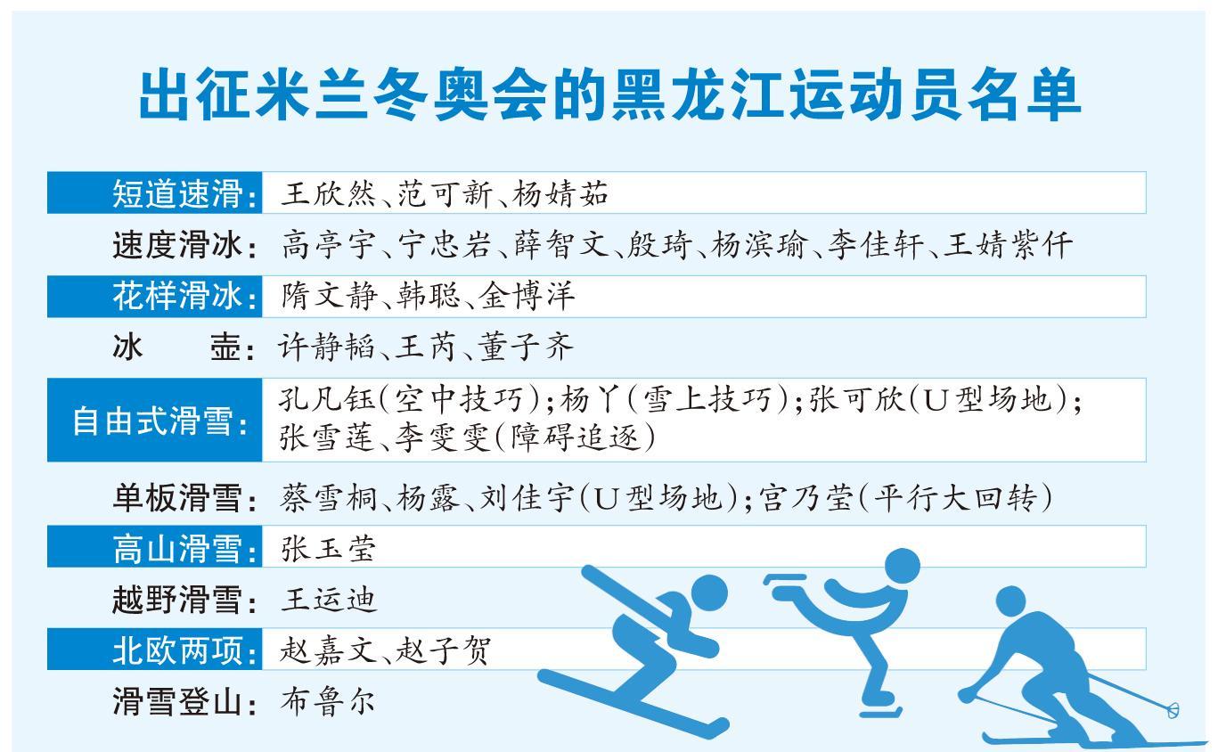 作为中国代表团在历届冬奥会上的王牌队伍,中国短道速滑队获得米兰冬奥会5男5女共10人的满额参赛名额,其中黑龙江3名女将入围名单,分别是老将范可新和王欣然、杨婧茹两位00后小将;速度滑冰项目,龙江“双子星”高亭宇、宁忠岩将是目前国家队的领军人物,此外入选的黑龙江运动员还有薛智文、殷琦、杨滨瑜、李佳轩以及王婧紫仟;双人滑卫冕冠军隋文静/韩聪仍是中国花样滑冰队在米兰的最大夺牌希望,此外老将金博洋本赛季状态也较为出色;冰壶项目中,黑龙江运动员许静韬入选男队阵容,女队则有王芮、董子齐两名黑龙江运动员,其中王芮是目前这支中国女队的核心。