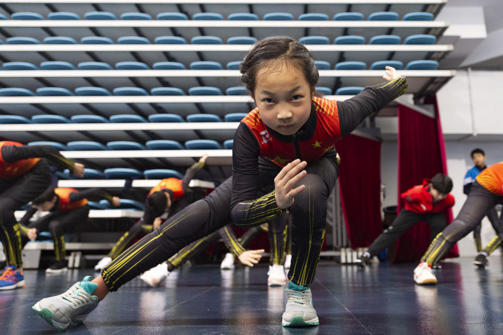 在七台河体育中心,七台河职业学院短道速滑训练中心的孩子们在上冰前热身。新华社记者 谢剑飞 摄